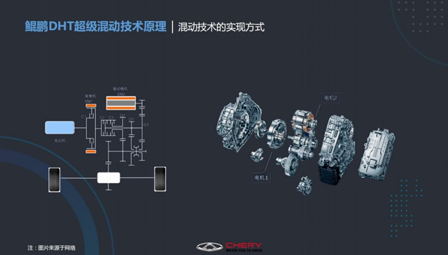 与国外车企惯用的高功率燃油机搭配低功率电机动力组合,并联构型“少用油”方式实现省油,或以电机驱动为主串联构型,通过“多用电”方式省油不同。作为第二代混动系统代表,奇瑞鲲鹏 DHT 超级混动系统跳出了传统混动构型“油电加减法”方式降低油耗的设计桎梏,通过核心技术突破,实现油、电的智能优化使用,最终实现能量的高效利用。