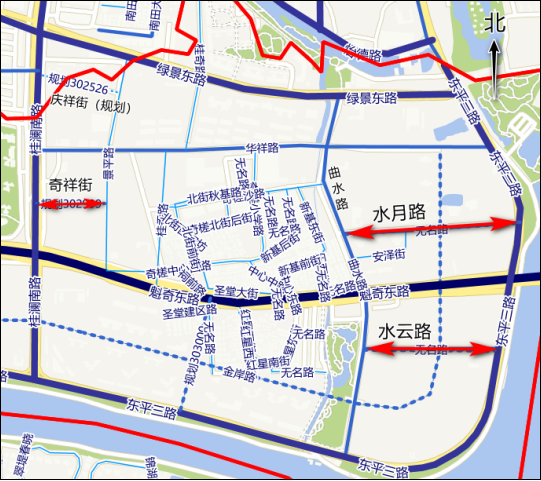 “奇祥街”“水月路”“水云路”道路示意图