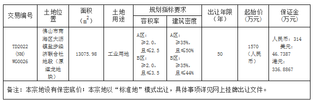 经佛山市人民政府批准,佛山市自然资源局决定委托佛山市公共资源交易中心南海分中心采用网上挂牌方式出让下列地块的国有建设用地使用权。现将有关事项公告如下: