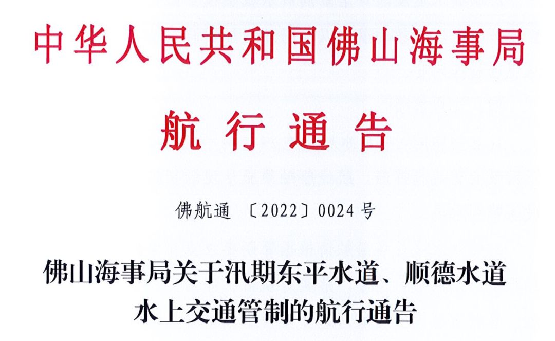 顺德水道濠滘口至紫洞口水域实施全面封航,管制期间禁止除公务、应急救助船艇以外船舶通过管制水域,特殊情况须听从现场指挥调度。