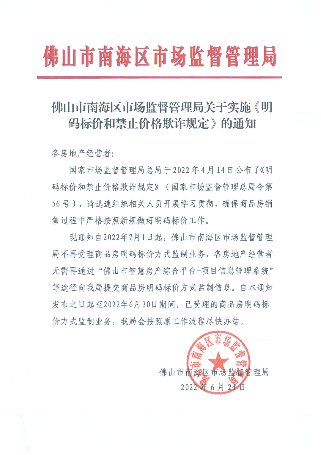 现通知自2022年7月1日起,佛山市南海区市场监督管理局不再受理商品房明码标价方式监制业务,各房地产经营者无需再通过“佛山市智慧房产综合平台-项目信息管理系统”等途径向我局提交商品房明码标价方式监制信息。自本通知发布之日起至2022年6月30日期间,已受理的商品房明码标价方式监制业务,我局会按照原工作流程尽快办结。