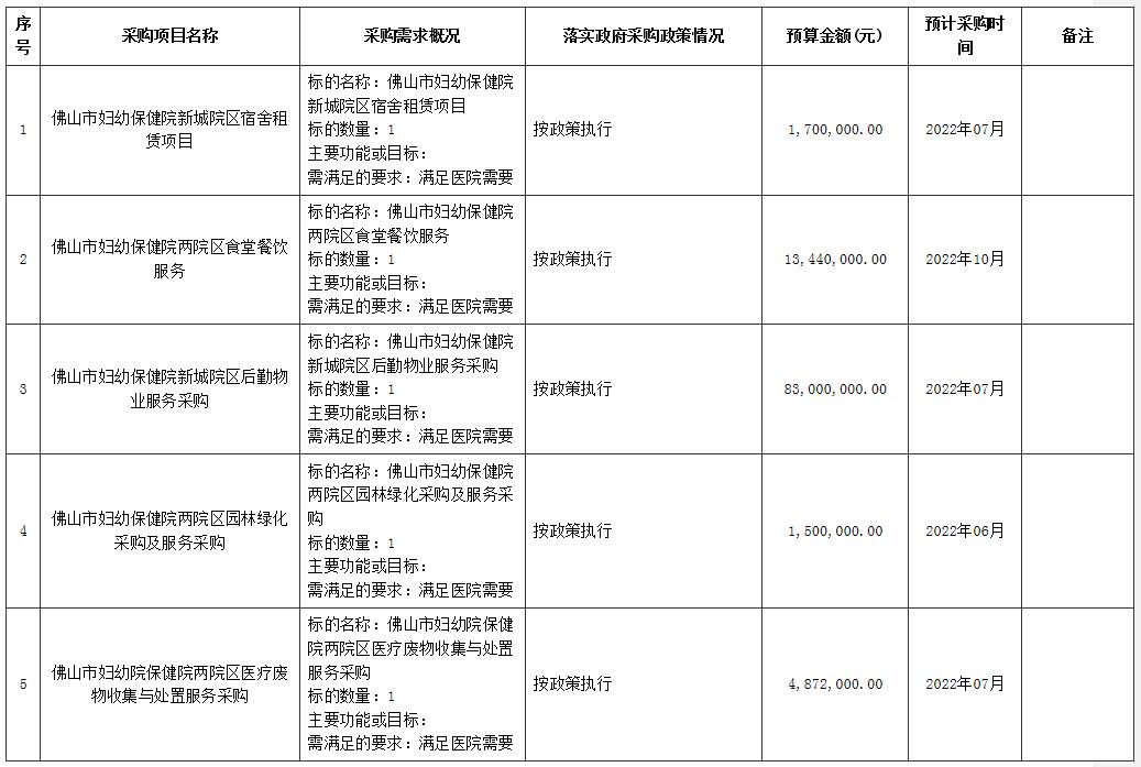 佛山市妇幼保健院2022年06月至2022年10月政府采购意向