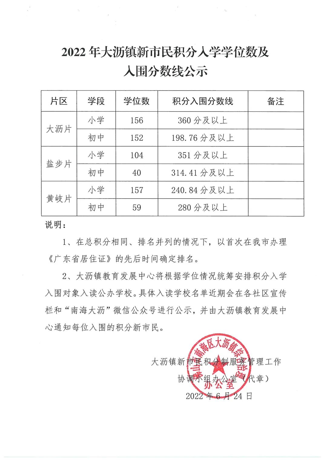 2022年大沥镇新市民积分入学积分分数线已公示,现将新市民申请积分入学入围名单及排名予以公示。市民可登录大沥镇政府网站或关注“南海大沥”微信公众号查看,也可到社区宣传栏查看。