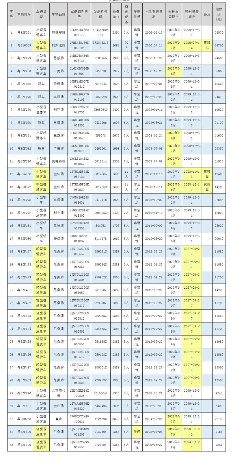 公务用车一批(共33辆,分拆拍卖,详见附后《拍卖标的清单》)