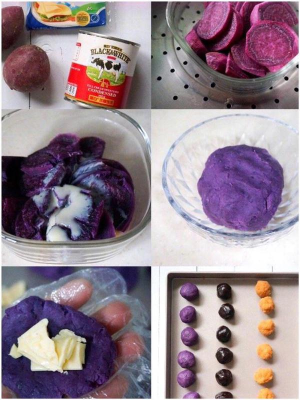 1. 把紫薯切好上锅蒸熟,然后用炸汁机加炼乳炸成泥,再搓成一圆团压扁在里面包进芝士片然后再搓成圆状。