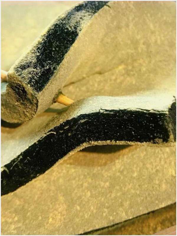 6. 在案板上洒上松花,再把艾叶团放上去,慢慢擀平,弄成两面都有松花,再切成块装就可以了。