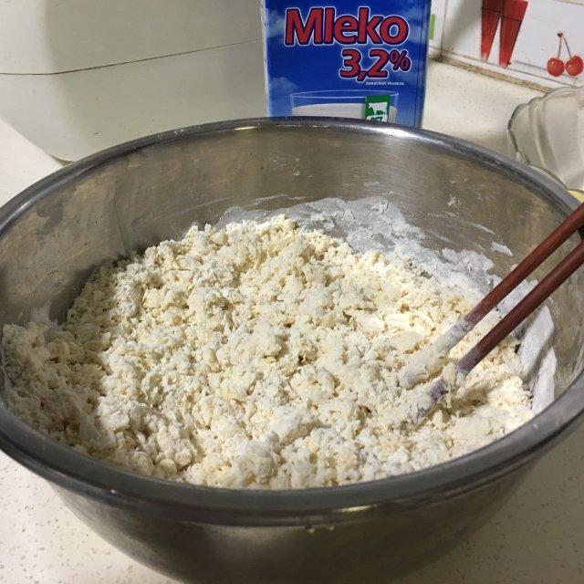 第1步、全蛋液打散,倒入牛奶,加入酵母粉、泡打粉、沙糖、盐拌匀,倒入面粉,拌成絮状。