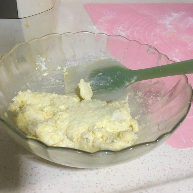 第5步、奶酪软化倒点牛奶放入白沙糖拌匀。