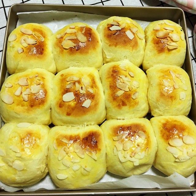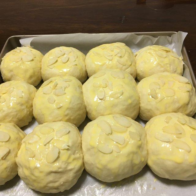 原料:高筋面粉、鸡蛋、奶酪、白沙糖、酵母、泡打粉、盐、牛奶、杏仁片。