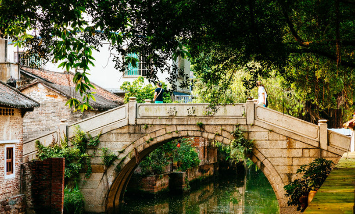 在出门见水,举步登舟的水乡顺德,自然少不了各式的古石桥。文化街的一旁保留着清代的单孔石拱桥,这座御波桥始建于清朝咸丰年间,“御波”寓意驾驭和制服洪水,寄托着水乡人家的美好祝愿。在这里,处处充满着水乡的特色,儿时的味道。