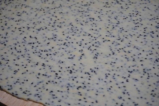 2.我们将它擀薄,尽可能的薄,只要不擀破,就继续擀,越薄,成品越脆。黑芝麻不是必须的,但是有它更香!大家可以将面团分成2-3份,这样小一点的更容易擀。