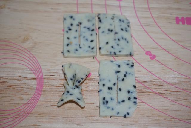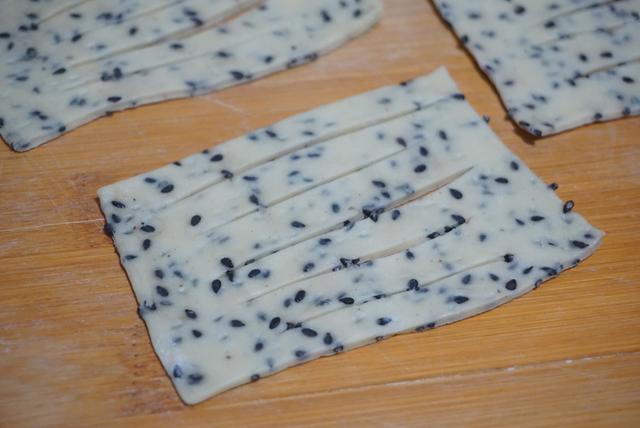 4.排叉就简单了,直接切长方片,中间划几刀。大家可能看这个面还是厚,但是这不是最后,等下我们还要扯一下,不然这个厚度直接炸出来,肯定咬不动,也不蓬松。