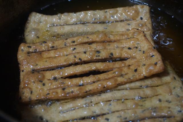 5.油锅大约是5成热,不要太热了,我们将它放入锅中前,慢慢地扯长,只要不断就继续扯,扯到快断开的时候,放入油锅中。