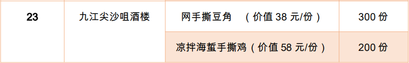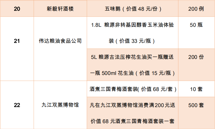 1、本次活动福利可以与佛山消费券、南海消费券叠加使用;2、本次活动福利可以无门槛使用,其中餐饮福利仅限堂食;3、本次活动福利适用于九江镇部分线下餐饮、零售、其他生活服务业;4、本次活动福利使用前,请咨询商家本券是否可与门店其他活动同时使用;5、本次活动最终解释权归九江镇宣传文体办和九江镇旅游美食联盟所有。