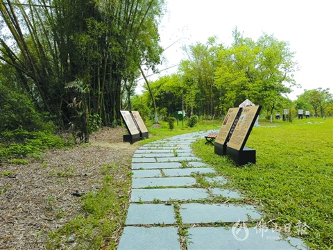 廉政公园内竹影婆娑,偶有阳光穿过竹林。
