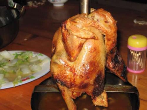 吊烧鸡这个名字不知是谁起的,也不知其他地方是否有这种做法。至于它的起源,很可能是从台湾带过来的,台湾的电视节目中看到吊烧鸡(台湾形象叫法是“立正鸡”,据说最适合老板请伙记,因为鸡头向上。)