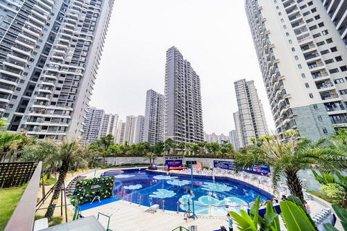 欧雅·右岸春天项目总占地约10万平方米,总建筑面积约35万平方米,由1座商业中心以及22座22~32层的高层住宅所组成。项目总计2373户,整体车位有2479个,车位比例超过1:1整个小区的园林属于法式浪漫风情风格,打造“一水一核,两带三轴,水岸交融,环湖共生”的滨湖复合生态社区、“公园式”花园。小区内拥有约8万方的园林水景,1200方的叠式泳池,1500方的户外体育、休闲场所。
