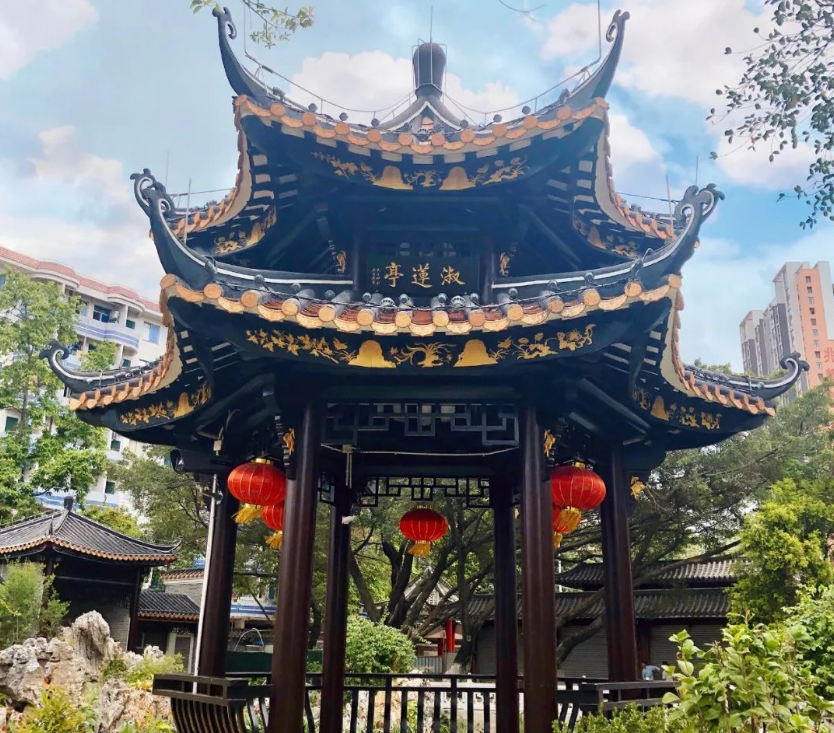 每座园林通常都有一个“制高点”,奏达俯视园景、一览无余的效果。莲花亭便是白莲公园观赏的制高点。它和观音洞、三叠泉组成了观音岩假山瀑布,通过岭南造园手法中的十八罗汉石砌筑法来打造出公园观赏的高潮。
