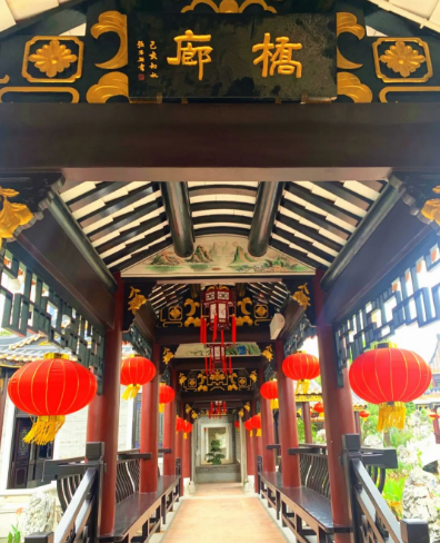 烈日当头,骄阳似火。沿着长廊漫步,一阵阵凉意沁人心脾。抬头可见金色的花草浮雕,古色古香。留心观赏,还能发现长廊上有花鸟、牧童等彩色壁画。大红灯笼、雕梁画栋……尽显岭南特色。