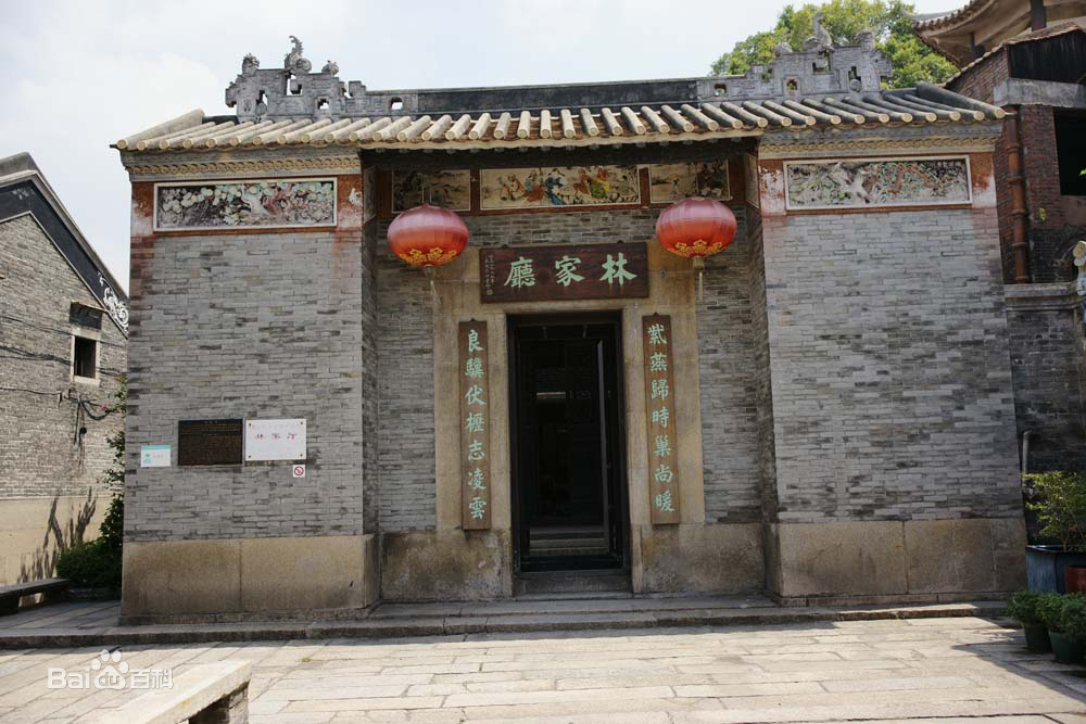 林家厅在石湾区石湾镇忠信巷14号,清代时既是住宅又作家庙,故又称林氏家庙。始建于明,清嘉庆年间重修。座落于镇岗南坡而座北向南,主体建筑由南至北依次是头门、前殿和后楼,均硬山顶,面宽三间,前殿进深三间,三进院落四合院式平面布局,建筑面积近200平方米。其建筑架构颇有特点,主体建筑的梁架均使用抬梁式结构,以驼墩及如意斗拱承托,红沙岩柱础为复盆式,部分有櫍,具明代特征;后楼为居室,楼下以砖墙分为厅堂和左右厢房,与天井左右厢房相通,二楼为木制楼面,布局小巧玲珑,进深仅二间;楼前有轩廊,抬梁式结构以驼墩和斗拱承托,而前金柱与后墙间则为抬梁与穿斗混合式架构,设计奇巧,别出心裁。建筑亦颇费心思,所使用的木雕装饰构件种类繁多,如屏风、花架、驼墩、隔扇、雀替及檐板等,均雕镂精细,布局得宜,使建筑更觉古朴优雅。林家厅在清嘉庆年间的主人林绍光,曾薄有功名,对其宅第的装修,可谓苦心孤诣。该建筑目前保存尚好,尽管规模不大,但其建筑架构及装饰工艺却独具特色,在当地颇为少见,具一定的历史和科学研究价值。