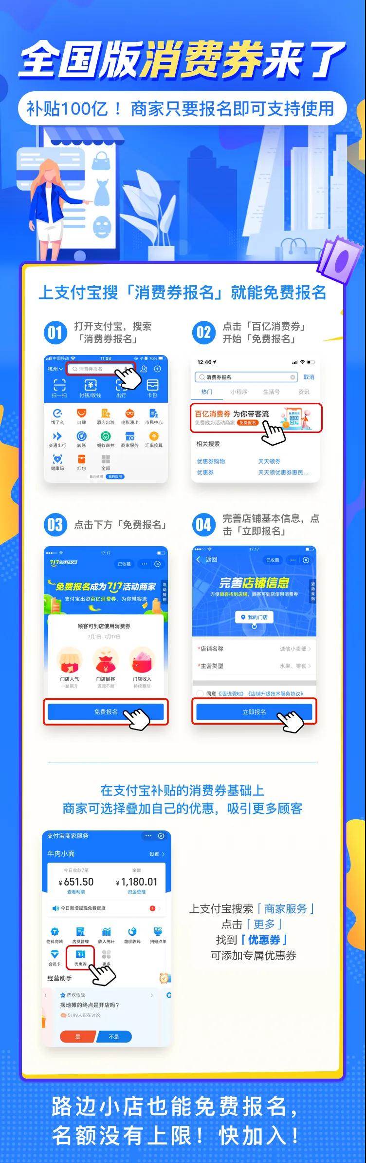 支付宝今日透露,从7月1日起连续17天发放全国通用的消费券,此次发券补贴总规模高达100亿。这也是消费券的首次全国性动作,支持全国通用,商家报名于即日开启。全国商家只要在支付宝搜索“消费券报名”,完成报名后即可在7月支持消费券核销。