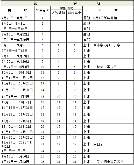2020-2021学年第一学期,全市普通中小学校统一于2020年9月1日开学,高三年级可根据国家课程计划和学校实际教学安排,适当调整开学时间,于8月10日开始新学年开学。小学、初中寒假起始时间为2021年1月24日,普通高中为1月31日;