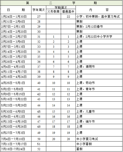 2020-2021学年第二学期,普通中小学校统一于2021年2月22日开学,暑假起始时间为7月11日。各普通中小学校要严格按照校历开展教育教学活动。