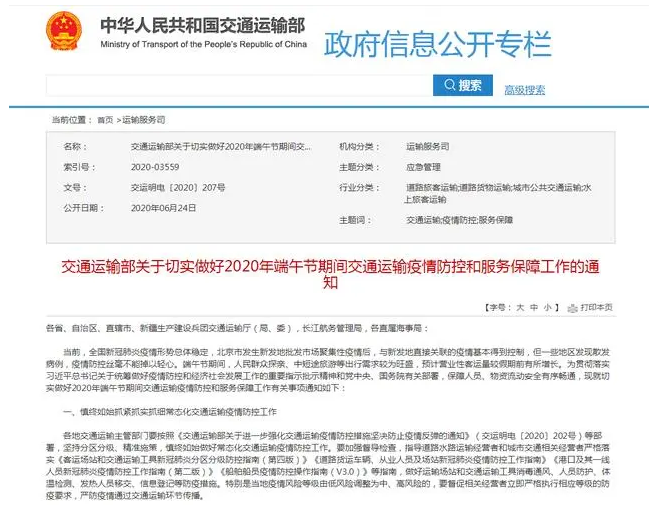 交通运输部网站6月24日发布《关于切实做好2020年端午节期间交通运输疫情防控和服务保障工作的通知》。通知指出,端午节期间和今后一段时期,各地继续暂停省际旅游客运,不得开放办理包车客运管理信息系统省际旅游客运业务备案。以下为通知全文。