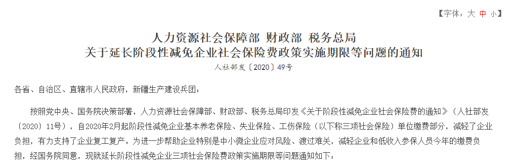 按照党中央、国务院决策部署,人力资源社会保障部、财政部、税务总局印发《关于阶段性减免企业社会保险费的通知》(人社部发〔2020〕11号),自2020年2月起阶段性减免企业基本养老保险、失业保险、工伤保险(以下称三项社会保险)单位缴费部分,减轻了企业负担,有力支持了企业复工复产。为进一步帮助企业特别是中小微企业应对风险、渡过难关,减轻企业和低收入参保人员今年的缴费负担,经国务院同意,现就延长阶段性减免企业三项社会保险费政策实施期限等问题通知如下: