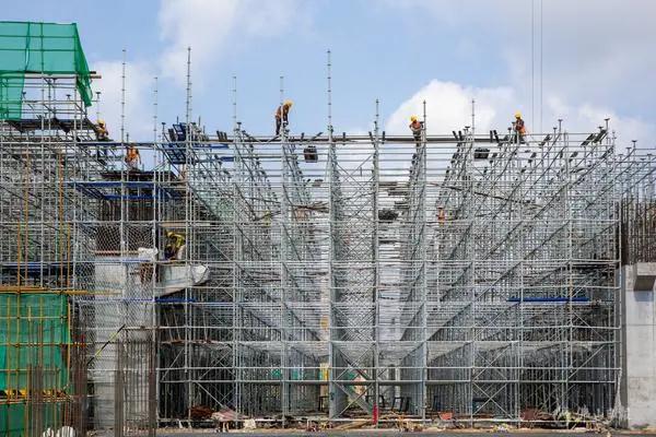 5月5日,佛山地铁2号线林岳车辆段,施工现场热火朝天,工人正在搭脚手架。佛山日报记者符诗贺 摄