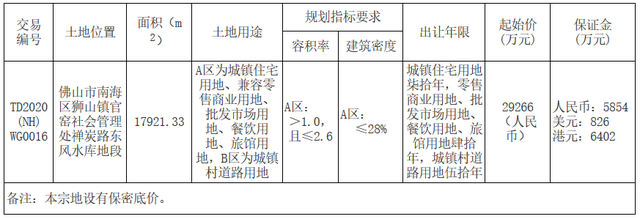 资料显示,该地块编号为TD2020(NH)WG0016,位于南海区狮山镇官窑社会管理处禅炭路。出让宗地面积17921.33㎡,其中A区面积15419.25㎡,B区面积2502.08㎡。起始价29266万元,竞买保证金5854万元。