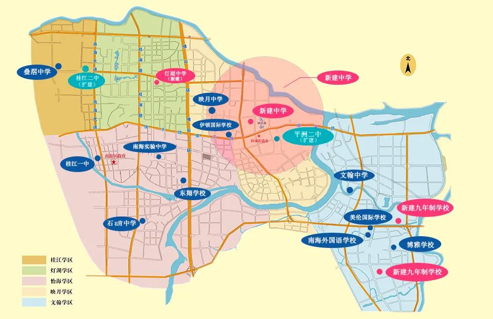 根据规划,桂城街道将在原有学校基础上,对桂江二中、平洲二中2所中学进行扩建,同时推进灯湖中学、映月湖西侧地块、映月新城片区地块、三山国际社区地块、林岳西TOD地块共5所新校建设。