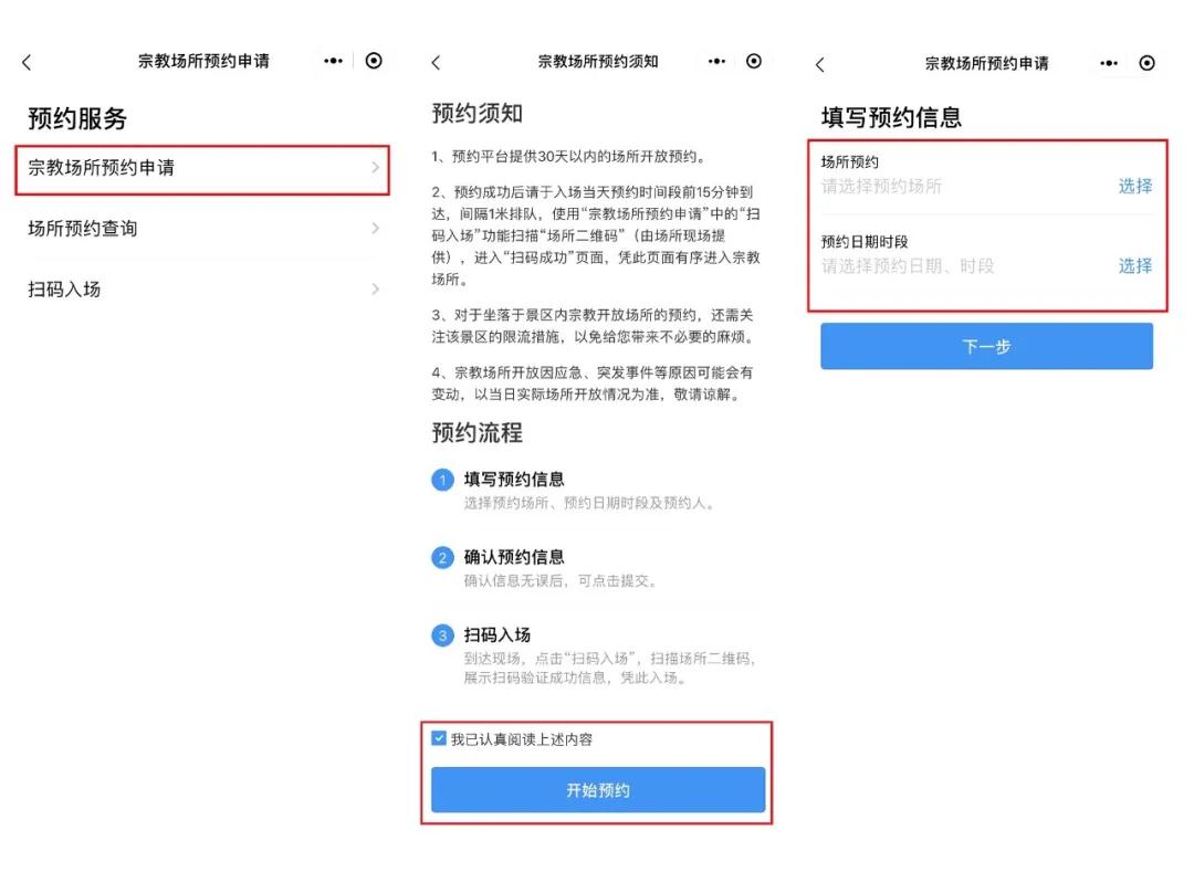 二、进入预约界面,点击“宗教场所预约申请”,认真阅读“预约须知”和“预约流程”后,点击“开始预约”。