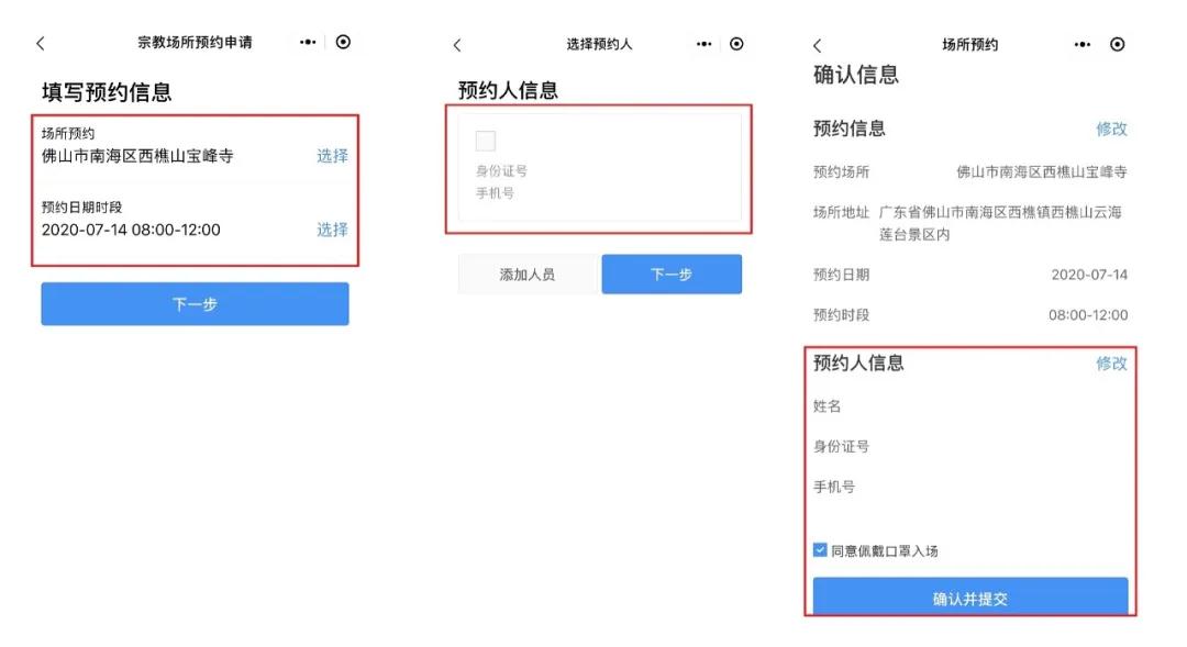 五、填写预约信息,核对并确认预约人信息后,“同意佩戴口罩入场”处打√,确认并提交。