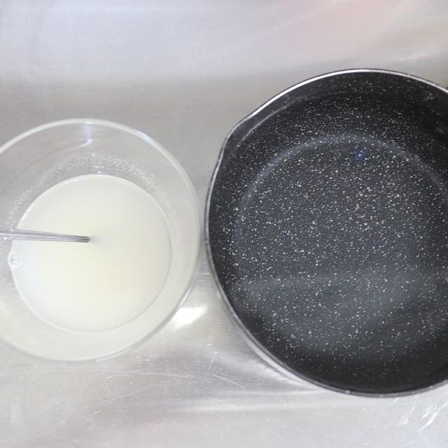 第2步、50克白凉粉用100ml的凉水浸泡,调成糊状,剩下的1100ml的凉水入小锅中。