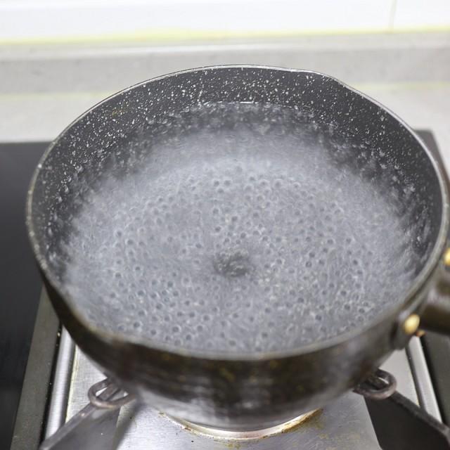 第7步、熬糖浆:红糖和凉水同入锅中;想要糖浆浓稠些可少放水,红糖和水的比例1:1熬制时间会短;想要糖浆稀一些,水就多放一点,为了保证浓郁的口味,红糖和水的比例1:2即可。