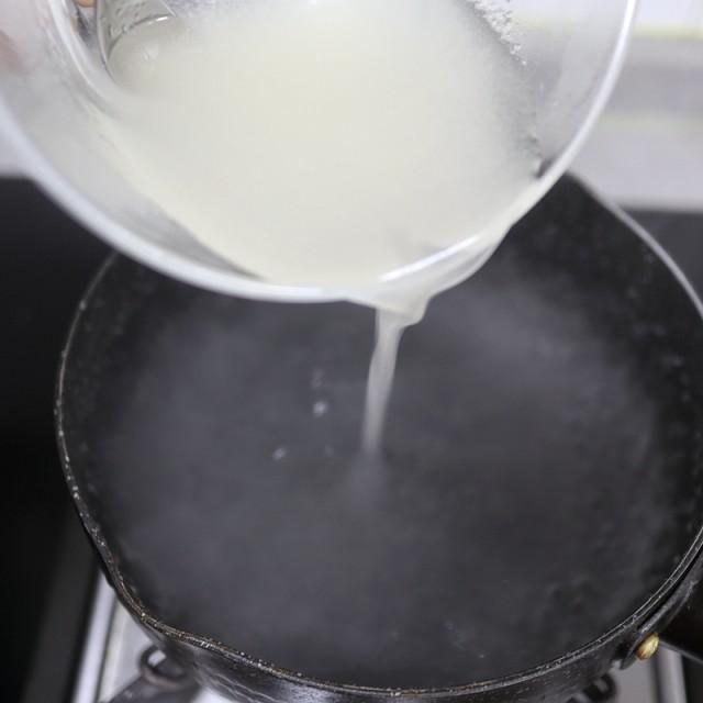 第4步、转中火,将白凉粉糊缓慢倒入锅中,一边倒一边用搅拌棒搅拌,防止落在一处成一坨。