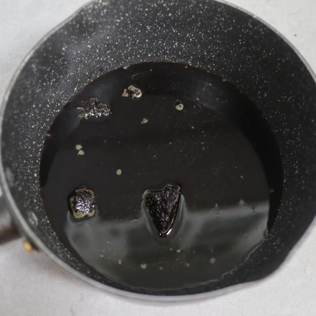 第8步、小火慢慢熬,熬到红糖浆舀起来之后有点挂勺就成了;红糖倒入碗中,晾到温乎时蒙上保鲜膜,放冰箱冷藏后使用,糖浆会更粘稠。