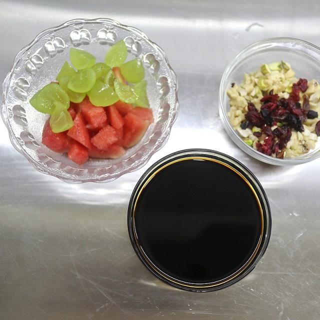第9步、准备做冰粉了:多种坚果切碎,应季水果切丁,红糖浆准备好。