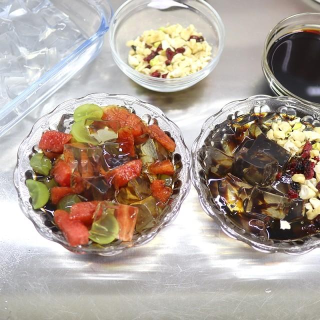 第11步、取干净的碗,先在碗底舀几勺红糖浆,再将冰粉块舀入碗中,表面撒坚果碎、水果丁,红糖也可淋在冰粉上,边吃边拌,红糖浆均匀地混合着冰粉,吃一碗,凉爽开胃。