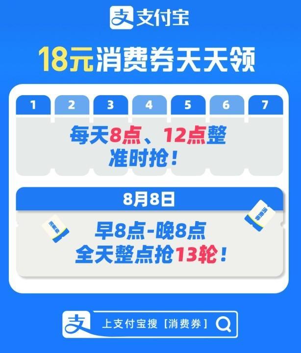 8月1日起,支付宝连续发放长达8天的全国消费券,价值累计高达10亿。消费者每天可在早上8点与中午12点准时开抢!尤其在8月8号当天,消费券更是从8点到20点连发13轮,可以从早抢到晚!