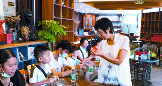 广东省工艺美术大师霍培英向市民传授陶艺微塑技巧。/张宝翔摄