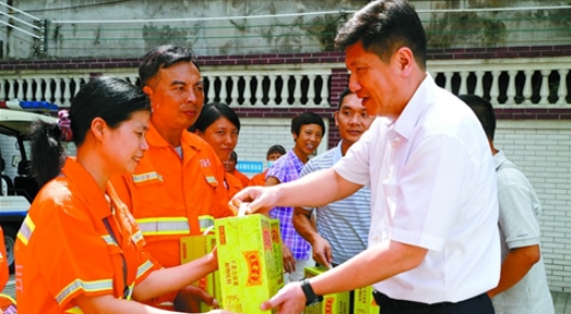 市总工会工作组为南海江景市政服务有限公司一线环卫工人赠送饮品。/佛山日报记者王旖荻摄