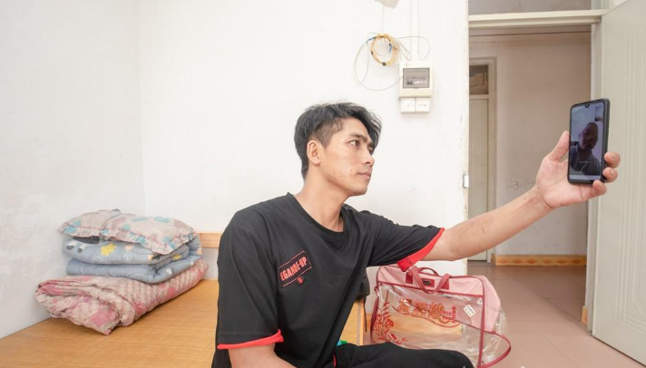 7月30日,在“全国文明村”佛山市禅城区南庄镇紫南村的帮扶下,术后康复中的魏月董和丈夫从此前租住的蜗居瓦房搬进紫南村内的员工村公寓,魏月董丈夫在新家和魏月董视频。佛山记者符诗贺摄