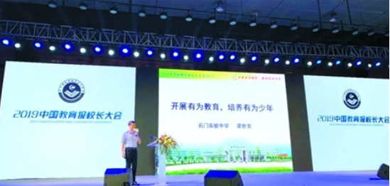 石门实验中学校长梁世安参加2019中国教育报校长大会,推广有为教育办学经验。/受访者供图