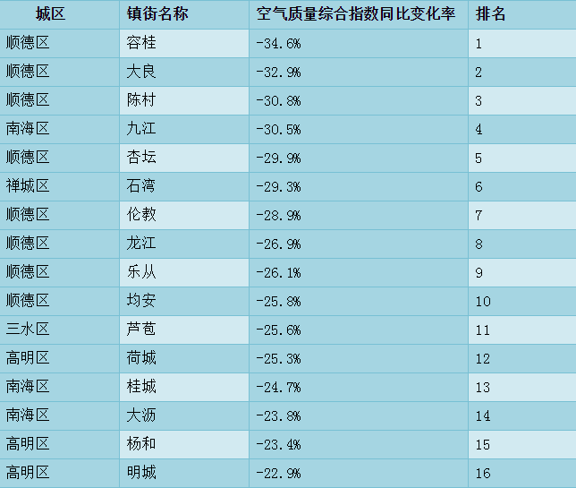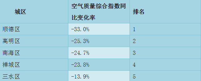 为落实各区、镇(街道)大气污染防治主体责任,进一步改善我市环境质量,自觉接受社会监督,佛山市对全市五区和32个镇街的空气环境质量面向全社会公开。空气环境质量以空气质量综合指数同比变化的形式进行公开,7月份空气环境质量结果通报如下: