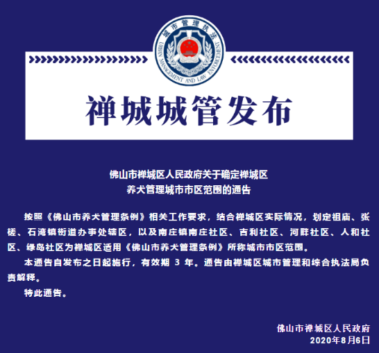 该通告指出,禅城划定祖庙、张槎、石湾镇街道办事处辖区,以及南庄镇南庄社区、吉利社区、河畔社区、人和社区、绿岛社区为适用《佛山市养犬管理条例》(以下简称《条例》)所称的城市市区范围。该通告自发布之日起施行,有效期3 年。