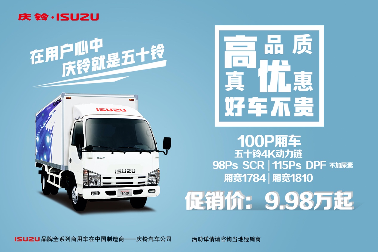 针对此次优惠促销活动,庆铃五十铃100P优惠7000元的力度,仅仅9.98万即可轻松开回家,用最少的价格让用户开上品质可靠的轻卡。高品质、中价位不仅是庆铃汽车为用户创造幸福生活的理念,也是庆铃五十铃长期以来不断坚持高品质底线,更是坚持为用户带来更高质量、更高标准轻卡的信心和保障。