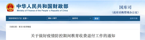 8月17日,财政部下发《关于做好疫情防控期间教育收费退付工作的通知》,进一步规范新冠肺炎疫情防控期间中央执收单位教育收费退付管理。
