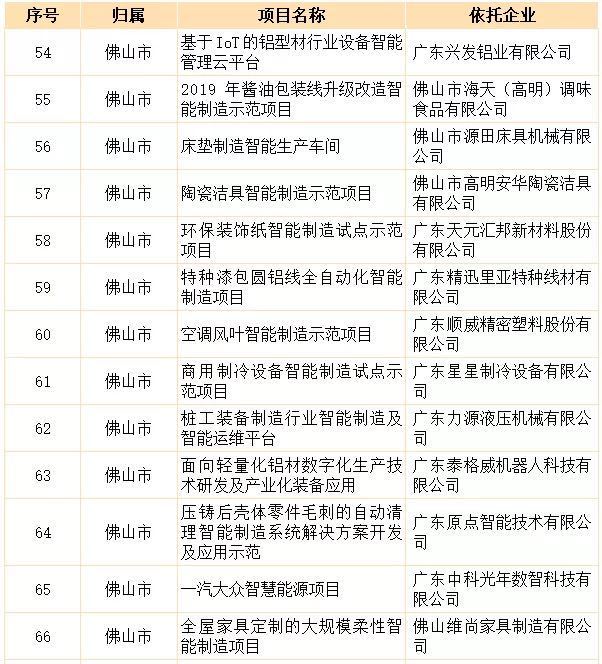 佛山入选的13个项目,包括广东兴发铝业有限公司的“基于IoT的铝型材行业设备智能管理云平台”、广东星星制冷设备有限公司的“商用制冷设备智能制造试点示范项目”、广东泰格威机器人科技有限公司的“面向轻量化铝材数字化生产技术研发及产业化装备应用”、广东中科光年数智科技有限公司的“一汽大众智慧能源项目”和佛山维尚家具制造有限公司的“全屋家具定制的大规模柔性智能制造项目”等项目。